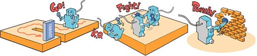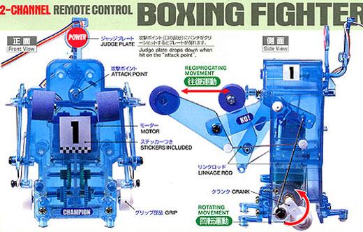 介紹的這個單挑機器人是由tamiya所設計的,構造簡單,用一把螺絲起子就能輕鬆組裝完畢。兩顆五號電池供電,透過電線來遙控小人的出拳和進退,它們還有一個專門的「沙袋」,供它們「練習」。