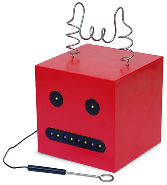 Mr. Robot Head is electronic, but does not require batteries. It is powered with a handle in the back that has wind-up action. The object of the puzzle is to get the looped wand from one side of the wires on top of Mr. Robot Head to the other without touching the wire itself. When the wand touches the tantalizingly coiled wire, the robot’s LED eyes will madly flash and Mr. Robot Head will make strange noises.
